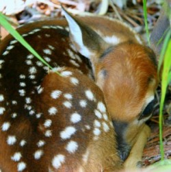 The dog loped down the trail, tongue dripping in the midday heat. The white-tailed doe knew it was the farm dog, for she had run across his scent every day of her life. He was the same yellow mutt that kept chasing her away from the green, juicy garden vegetables. She raised her head and stood at attention, waiting. Her baby was in plain sight, and the dog would find it if he knew where to look. She would lead the dog away if she had to.